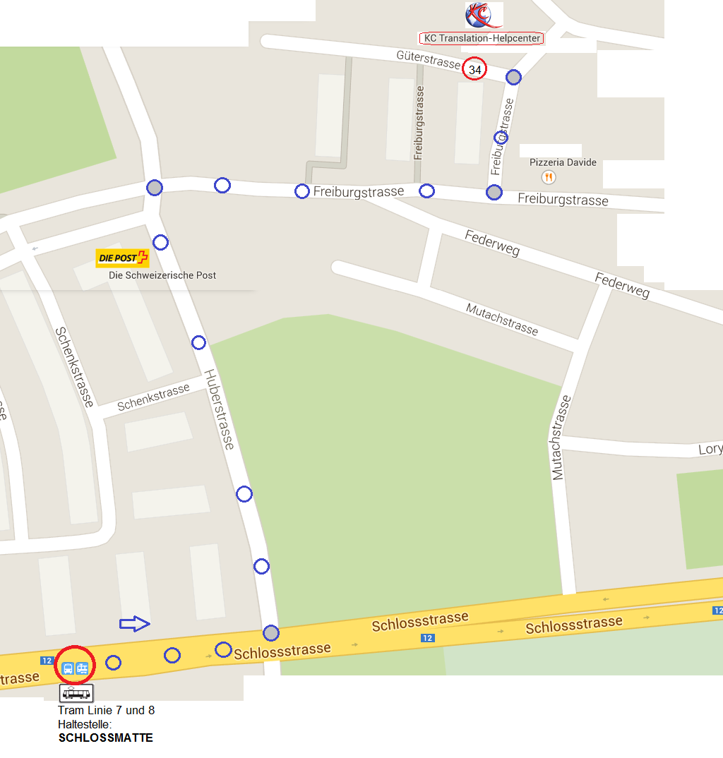 Fussgängerweg überqueren und leicht rechts abbiegen in die Friedbühlstrasse (leicht bergauf) bis zum Kreisel; dort links in die Freiburgstrasse einbiegen, geradeaus bis zur Pizzeria Settebello auf der rechten Seite, dort rechts und sofort wieder links in die Güterstrasse einbiegen (Sackgasse): Sie haben Ihr Ziel erreicht. - Sie können auch bis Schlossmatte fahren und auf der Schlossstrasse einige Schritte zurück und links in die Huberstrasse einbiegen.